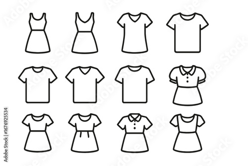 Fashion line icon set with dresses and t-shirts. Vector collection of clothing and apparel symbols. Editable stroke for web, apps, and graphic design. Simple garment outlines.