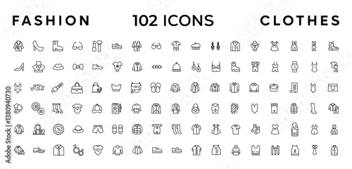 Fashion Minimal line icons collection. Jacket, Winter Coat, Sweatshirt, Dress, Hoody, Jeans, Hat icon for apps and website