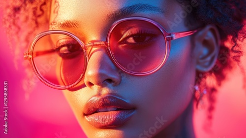 Fashion model wearing stylish sunglasses with futuristic lighting
