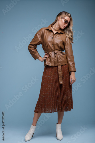 Fashion photo of a beautiful elegant young woman in a pretty brown leather jacket, brown long skirt, stylish sunglasses posing over blue background. Studio shot, portrait. Brown and blue colors