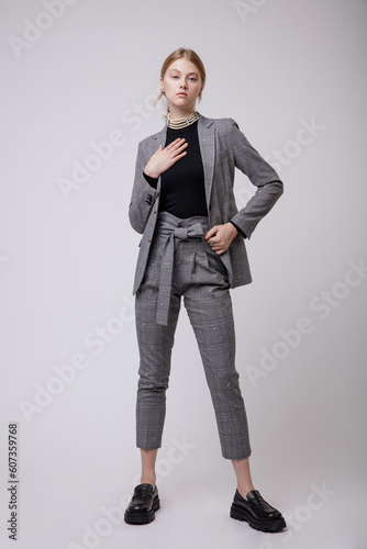 Fashion photo of a beautiful elegant young woman in a pretty gray suit, pants, trousers, jacket, blazer, black top, pearl choker posing over white, soft gray background. Studio Shot, portrait. Blonde