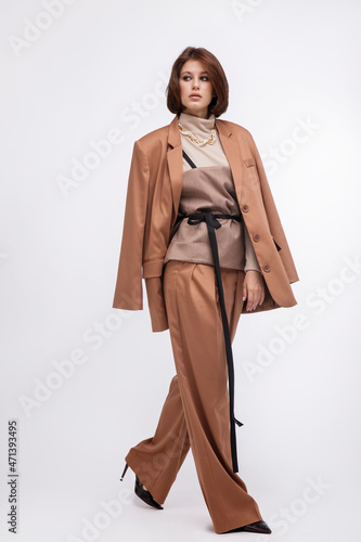 Fashion photo of a beautiful elegant young woman in a pretty oversize brown and beige suit, corset, jacket, pants posing over white background. Bob haircut. Studio Shot. Portrait