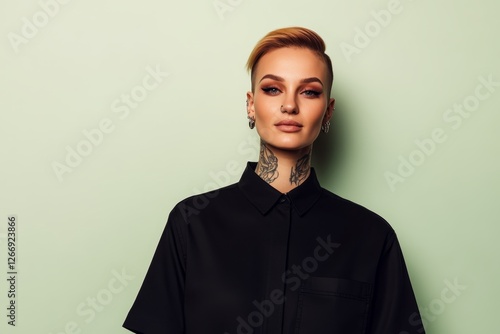 Fashion portrait of a stylish model with tattoos and modern hairstyle posing against a pastel green background