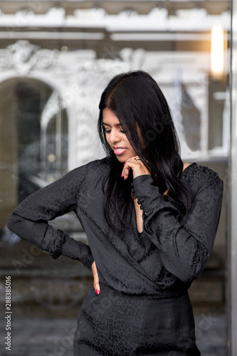 Fashion portrait of an indian stylish woman long hair and black business dress