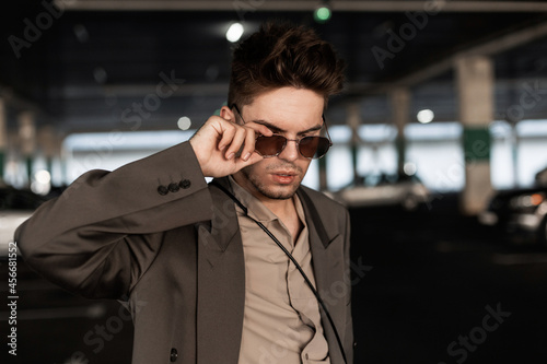 fashion portrait of handsome hipster guy in trendy blazer and shirt looks through sunglasses in the city. Urban male style