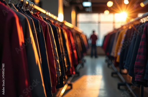 Fashion store sunset view with racks of diverse clothing in warm light