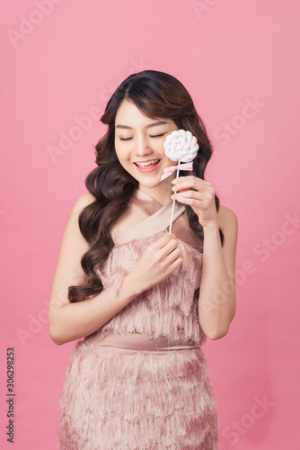 Fashion young woman with sweet makeup holding lolipop in her hands