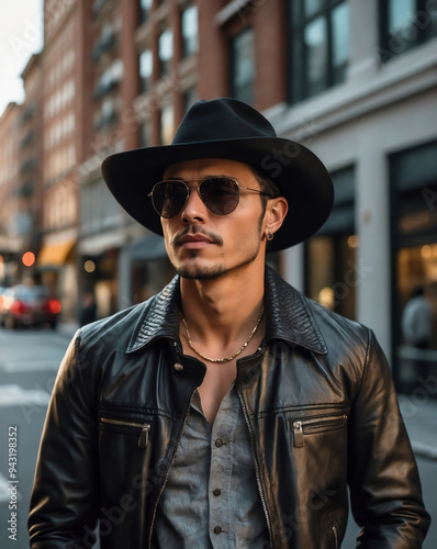 Fashionable man in black leather jacket and cowboy hat walking confidently through city streets, urban and stylish look