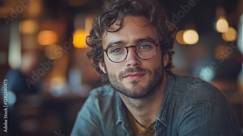 fashionable man with curly hair and stylish glasses posing in a comfortable setting showing his relaxed attitude and confidence during a casual conversation