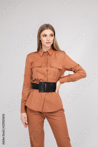 Fashionable young stylish woman posing in pantsuit with black belt medium long shot. Trendy fashionable female wearing classy casual clothing isolated at white studio background
