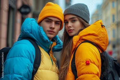 Fashionable young tourists wearing colorful down jackets and backpacks are posing in a city street