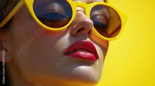 Fashionable Young Woman with Bold Sunglasses Against Yellow Background