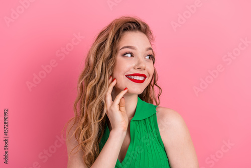 Fashionable young woman with vibrant smile, colorful attire, and cheerful expression on pink background showcasing beauty