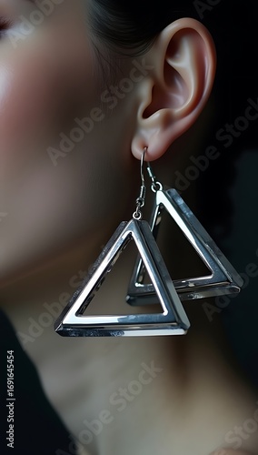 Fashion-focused close-up of triangular silver geometric earrings, modern and artistic style with bold composition.