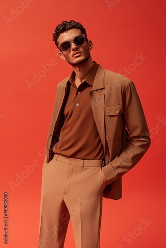 Fashion-forward man in brown posing against red back