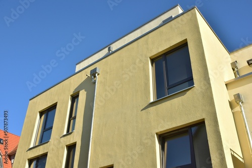 Fassade einer neu gebauten modernen Mehrfamilien-Wohnanlage