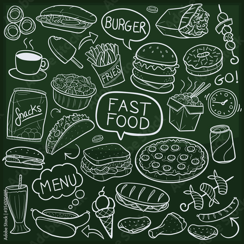 Fast Food Doodle Icon Chalkboard Sketch. Restaurant Menu famous Dishes.
