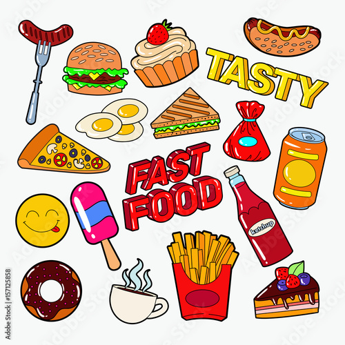 Fast Food Doodle with Pizza, Burger and Fries. Junk Unhealthy Eating. Vector illustration