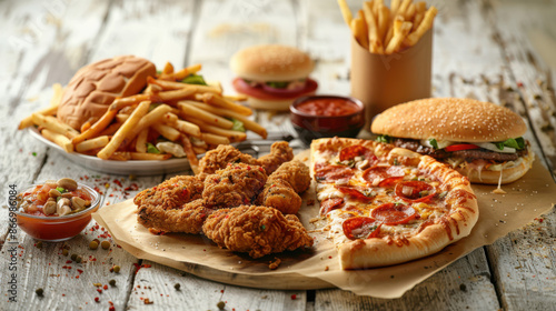 fast food items such as pizza, fried chicken, french fries, and a burger, arranged on a rustic white wooden table