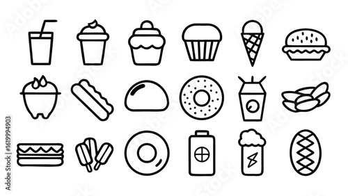 “Fast Food Line Art Set – Minimal Outline Vector Illustrations of Burgers, Pizza, Snacks, and Drinks Fast food, line art, outline icons, vector illustrations, minimal design, burger icon, pizza