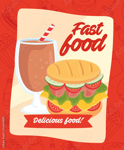 fast food poster, hamburger and delicious beverage