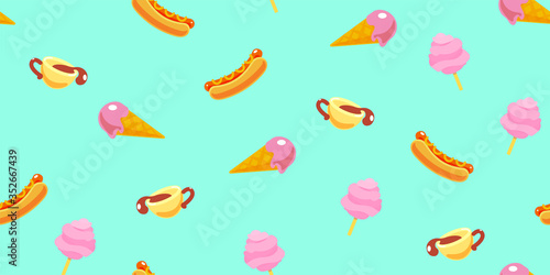 Fast food seamless pattern in modern style. Tasty Cover texture with hot dog, coffee, cotton candy, ice cream. Repeat vector banner. Snack for decorative cafe background, wallpaper