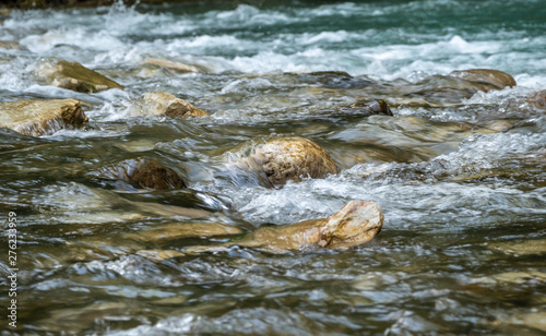 Fast mountain stream with rocky shores.
