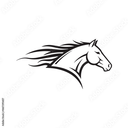 Fast running horse head logo. Stylized stallion vector icon with flowing mane.