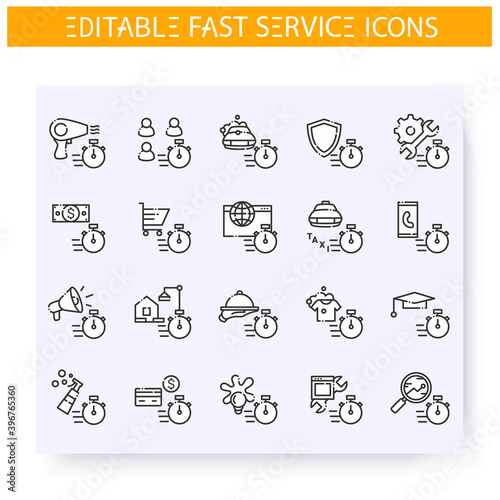 Fast service line icons set. Quick client service, support, production and maintenance. Express solutions, short term, time management concept. Isolated vector illustrations. Editable stroke
