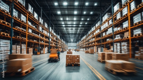 Fast-Paced Warehouse Motion Blur, Logistics, Cardboard Boxes, Forklifts, Storage, Inventory Management Logistics, Warehouse