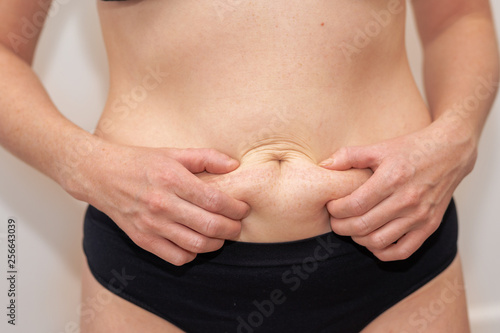 Fat female belly, woman holding her skin for cellulite check. Getting rid of belly fat and weight loss. Women body fat belly front view