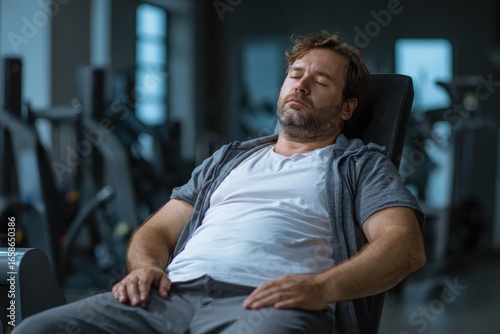 Fat man rests after intense workout on simulator in modern gym during late afternoon hours