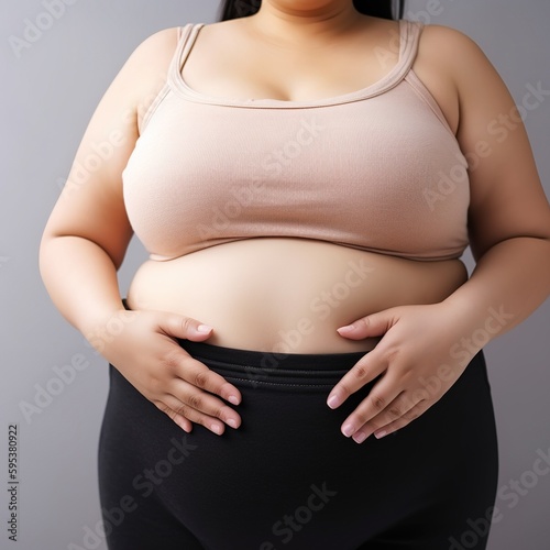 Fat woman measuring her stomach isolated on white background. Overweight, Obesity. Woman diet lifestyle concept. generative ai