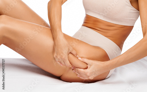 Fat woman with cellulite on her legs. Obese woman in white underwear.Overweight treatment.