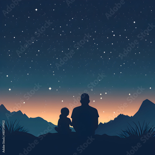 Father and child watching the stars on a clear night, concept for happy father's day poster or card template design