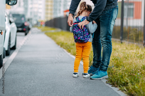 Father and daughter going to school for the first time. Back to school after pandemic.