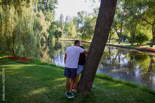 Father and daughter in the park on a summer morning spending time together enjoying nature.