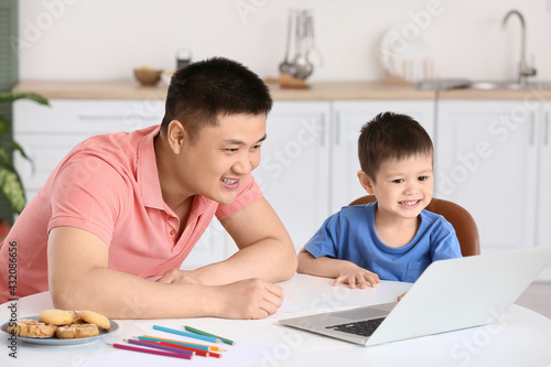 Father and his little son with laptop in kitchen