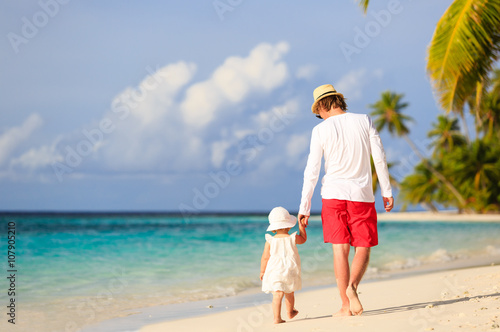 father and little daughter walking on beach