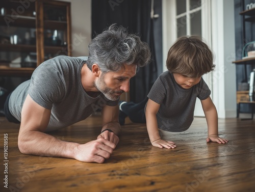 Father and son bonding through a home fitness routine