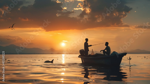 Father and son catching fish from a boat at sunset.