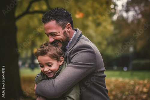 father and son hugging in the park, father's day, loving moment, autumn, generative ai