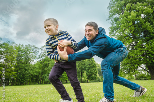 Father and son playing football, Father's day, Playful Man teaching Boy rugby outdoors in sunny day at public park. Family sports weekend.