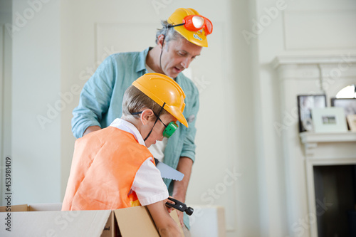 Father and son playing in cardboard box