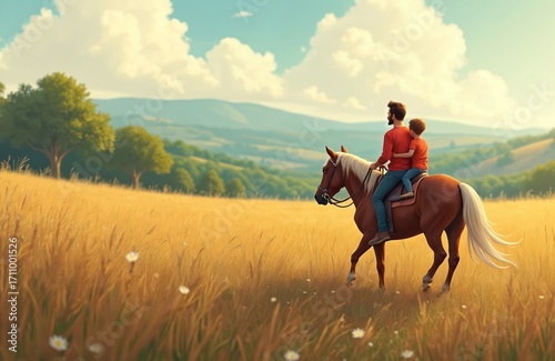 Father and son ride horse through golden field with green hills. Family enjoys nature, countryside bonding, summer vacation time, peaceful rural landscape background, sunny day.