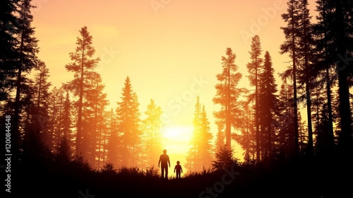 Father and Son Silhouetted Walking Sunset Forest Path
