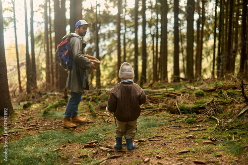 Father and son walking in autumn forest