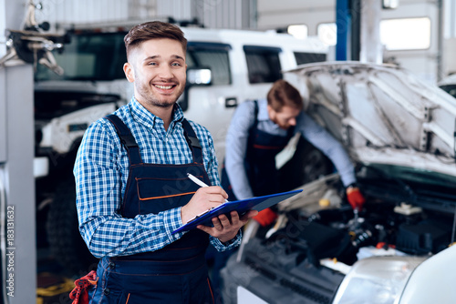 Father and son work at the auto service. Two mechanics work with the details of the car.