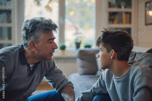 Father and teenage son having conversation in sunny living room. Bonding, communication and relationship concept.