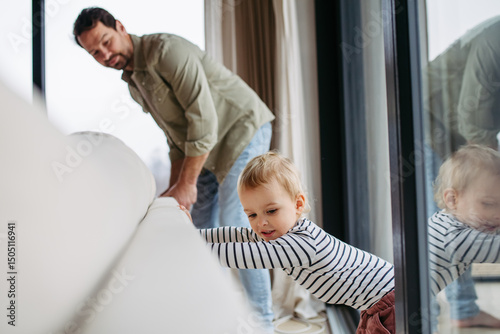 Father and toddler son moving couch at home